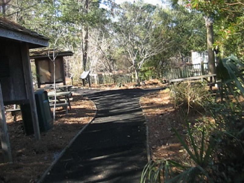 The trail is FREE and is lighted to be enjoyed any time. If you arrive Mon-Fri 9-1, visit the log cabin at the end of the trail, which has one room of flora and wildlife exhibits (alligator, bobcat, fox, beaver, feral hog head, beehive)and a clean bathroom.