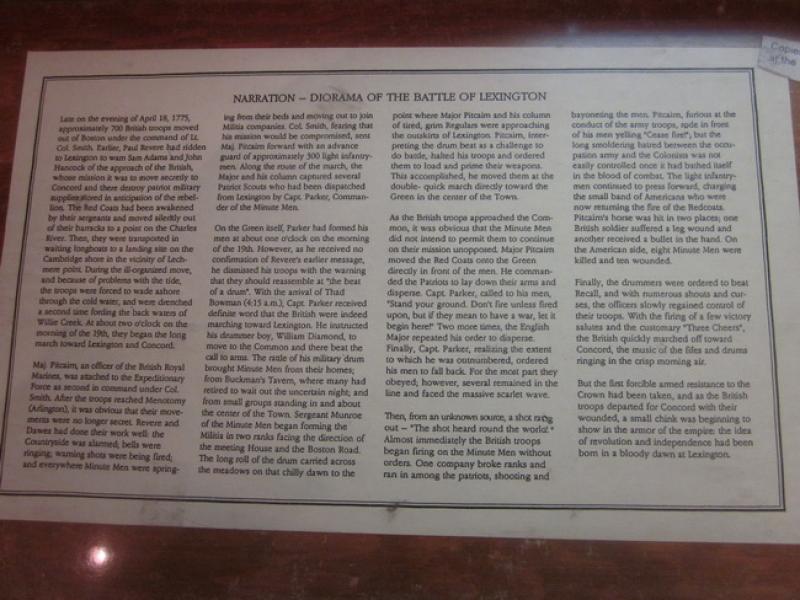 Lexington Visitors Center: First take a look at the historic diorama depicting the battle on the Green, ask about FREE Battle Green tours (Apr-Oct) and then check out the things you can see, find places to sleep, eat and use the clean rest rooms.